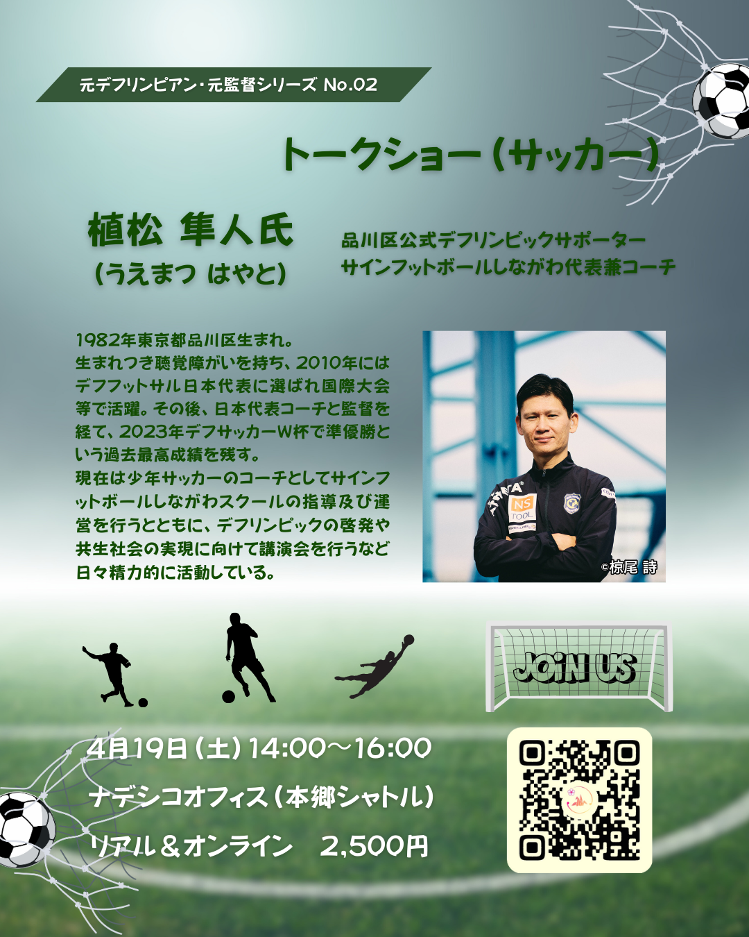 デフサッカー日本代表チームの監督を務めた植松隼人氏をお招きし、特別トークショーを開催いたします!