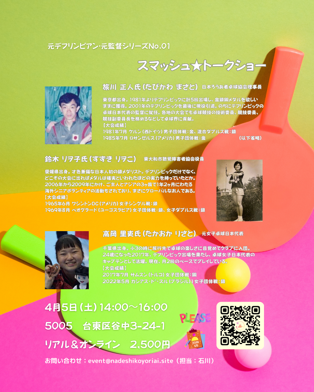 この度、撫子寄合企画の元デフリンピアン・元監督シリーズNo.01「スマッシュ⭐︎トークショー」を開催する運びとなりました。 デフリンピックの卓球競技で、金・銀・銅メダルを総なめした旅川正人氏をはじめ、日本人初の銀メダル獲…