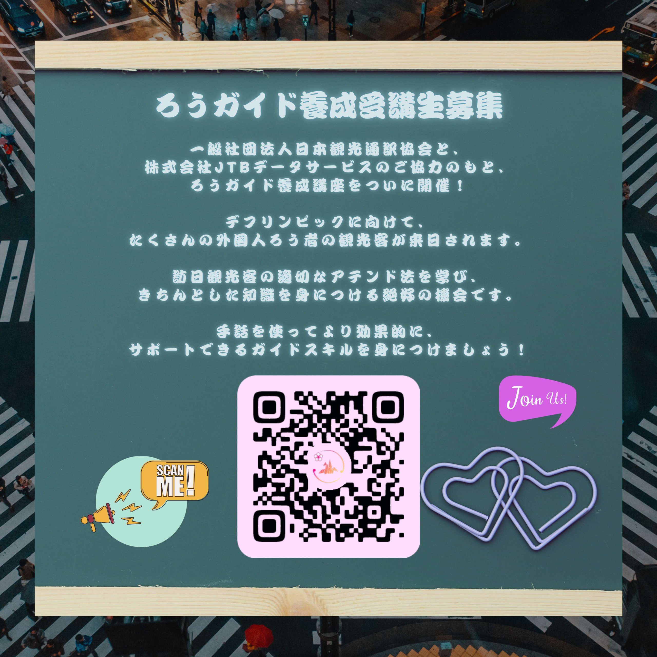 一般社団法人日本観光通訳協会&株式会社JTBデータサービスの協力のもと、ろう者のためのガイド養成講座をついに開催! デフリンピックに向けて、たくさんの外国人ろう者が日本を訪れます。 外国人ろう者に対して、適切なアテンド方…