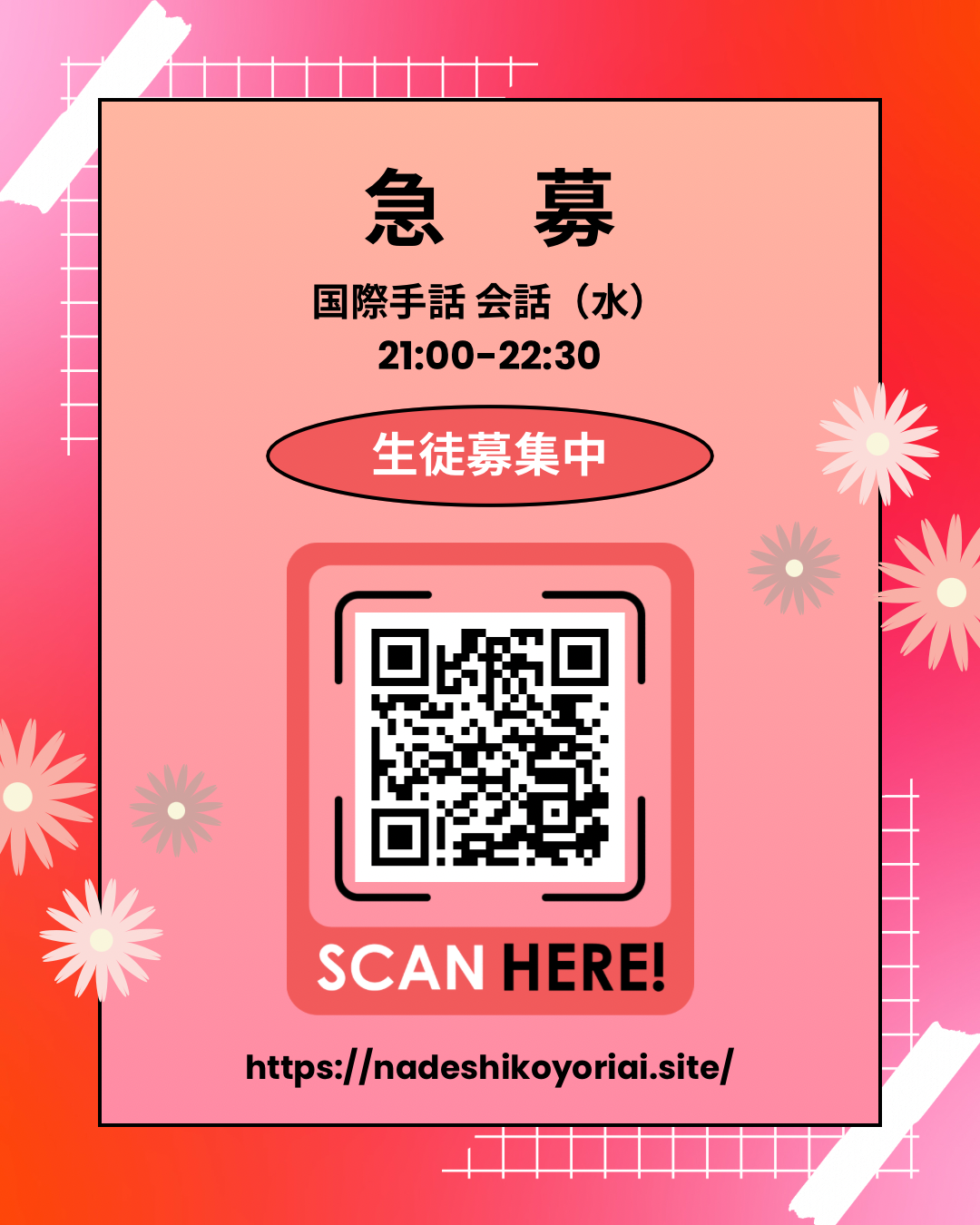 記載漏れしておりました「国際手話 会話(水)21:00-22:30 ZOOM メグミ先生」の受講者を至急募集いたします!
