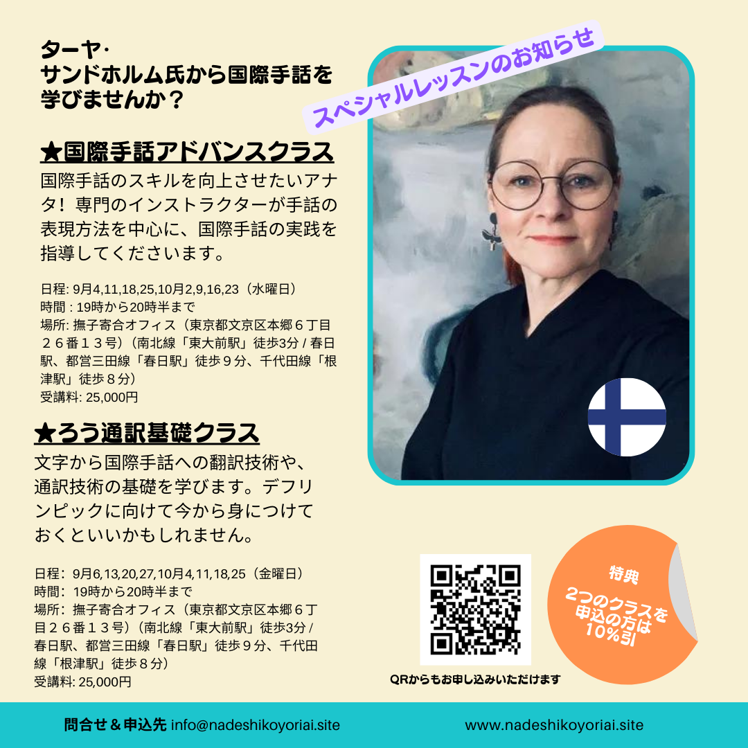 フィンランドでろう通訳、盲ろう通訳、そしてろう移民のための通訳を行っているターヤさんから、国際手話やろう通訳の方法を学んでみませんか? ターヤさんは30年以上の経験を持ち、学び甲斐のあるレッスンを提供してくれます♪ この…