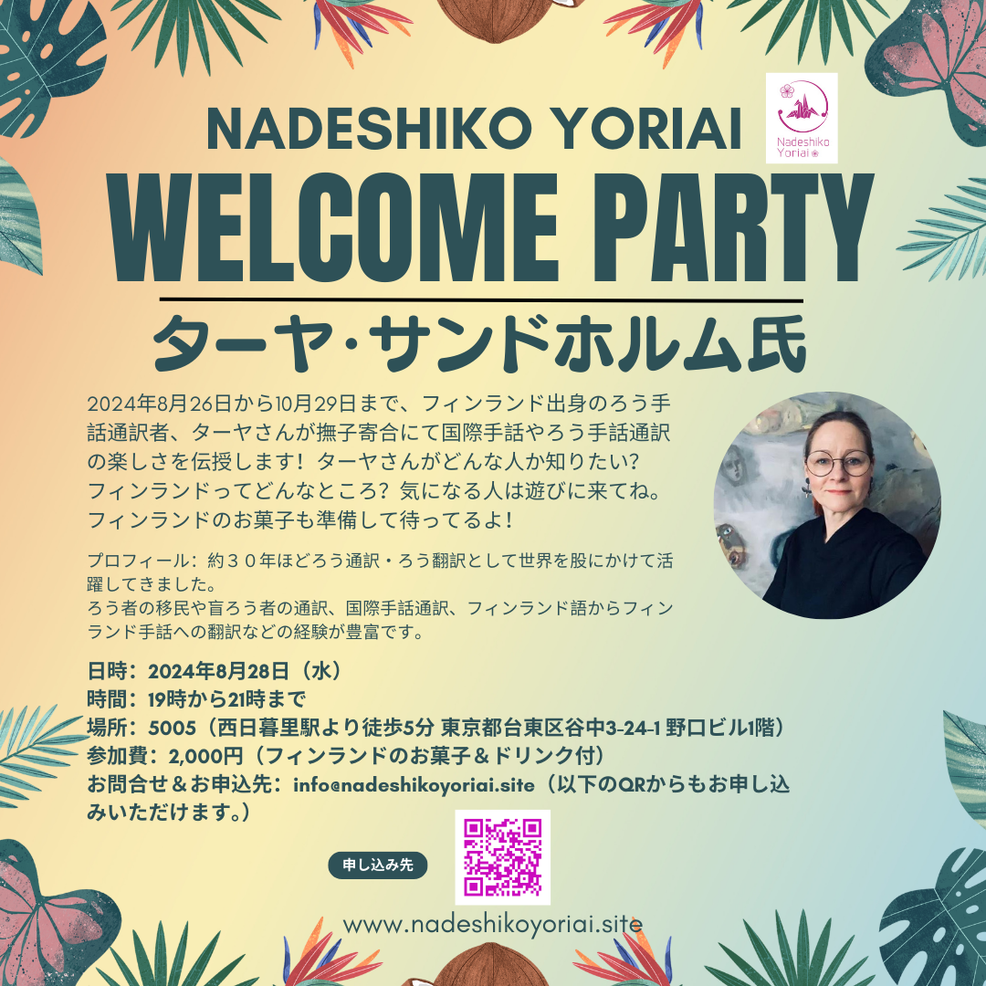 ナデシコは、話題の5005にてターヤ・サンドホルム氏のウェルカムパーティーを開催します。 フィンランドのお菓子をお楽しみいただきながら、ターヤさんと直接交流する貴重な機会です。 フィンランドについても学びながら、楽しいひ…